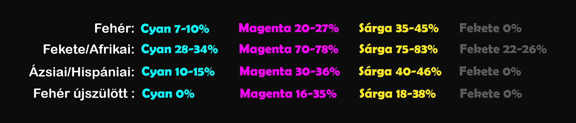 Harmadik módszer ami már kicsit összetettebb különböző nemzetíségű/bőrszínű embereknél vagy újszülötteknél a fehéregyensúly szintén megtréfálhat minket, ha tökéletes bőrszínt szeretnénk elérni akkor abban az alábbi táblázat segítség lehet: